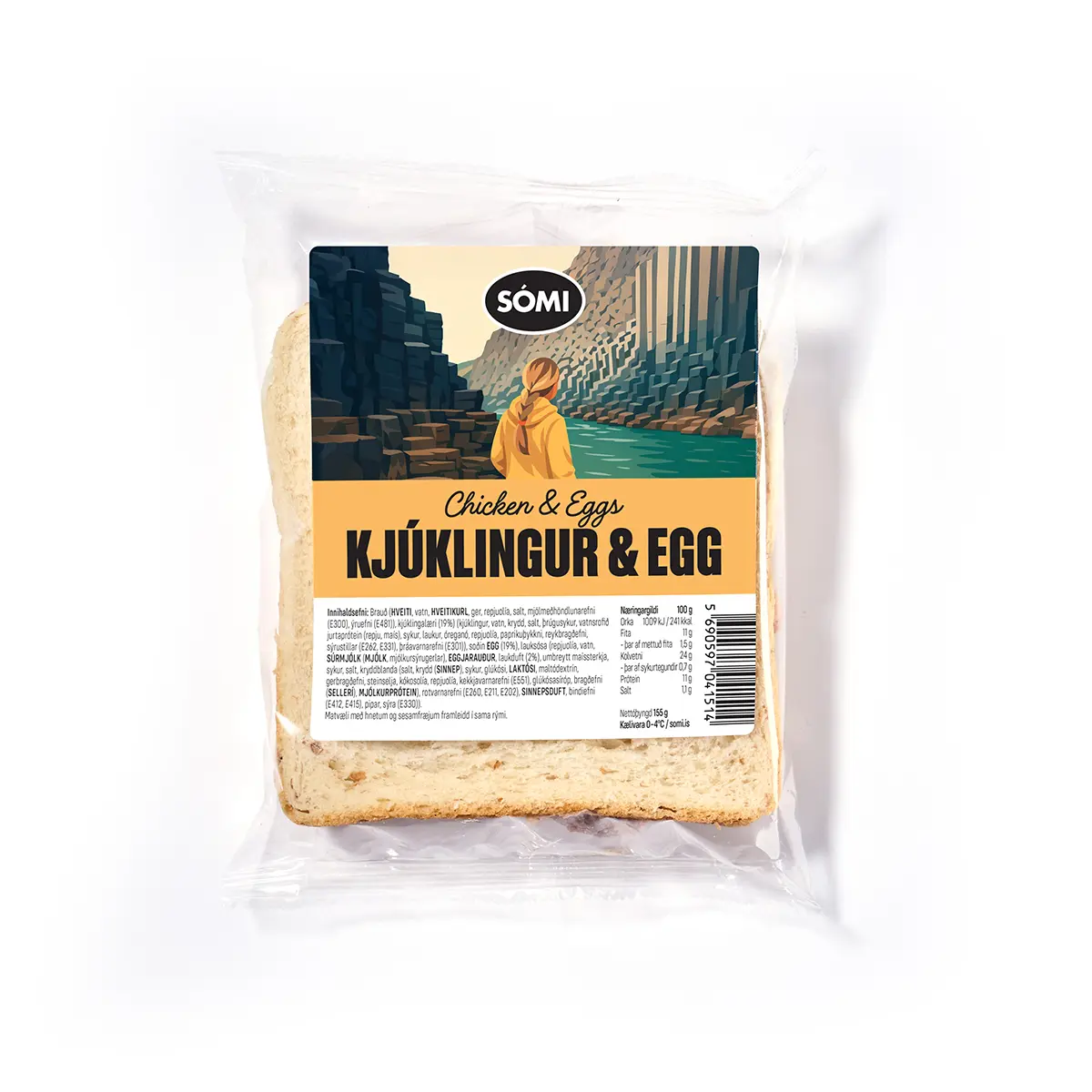 Brauð (HVEITI, vatn, HVEITIKURL, ger, repjuolía, salt, mjölmeðhöndlunarefni (E300), ýruefni (E481)), kjúklingalæri (19%) (kjúklingur, vatn, krydd, salt, þrúgusykur, vatnsrofið jurtaprótein (repju, maís), sykur, laukur, óreganó, repjuolía, paprikuþykkni, reykbragðefni, sýrustillar (E262, E331), þráavarnarefni (E301)), soðin EGG (19%), lauksósa (repjuolía, vatn, SÚRMJÓLK (MJÓLK, mjólkursýrugerlar), EGGJARAUÐUR, laukduft (2%), umbreytt maíssterkja, sykur, salt, kryddblanda (salt, krydd (SINNEP), sykur, glúkósi, LAKTÓSI, maltódextrín, gerbragðefni, steinselja, kókosolía, repjuolía, kekkjavarnarefni (E551), glúkósasíróp, bragðefni (SELLERÍ), MJÓLKURPRÓTEIN), rotvarnarefni (E260, E211, E202), SINNEPSDUFT, bindiefni (E412, E415), pipar, sýra (E330)).